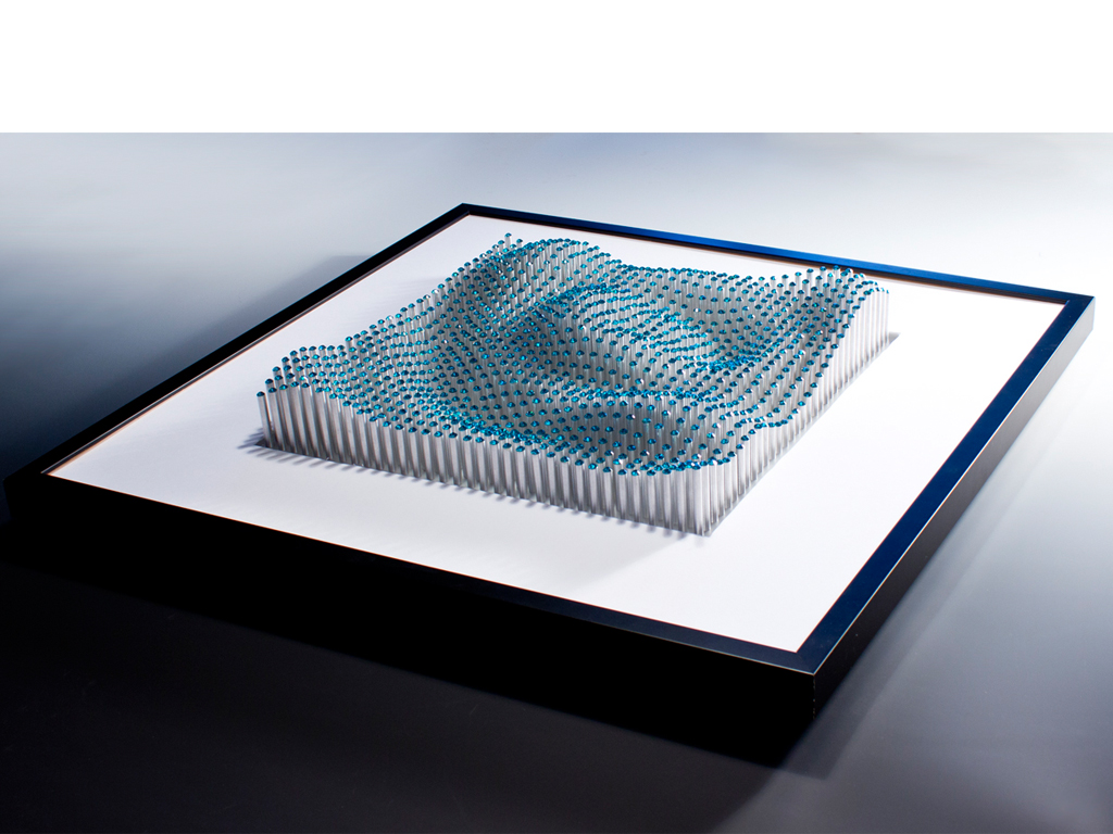 This was first modeled with an algorithmic modeling software called Grasshopper to mimic the surface of water. The 3d models information was then extracted into an excel document and fabricated on a metal lathe. The second image is of the completed artwork. The rendering was done in Brazil for Rhino