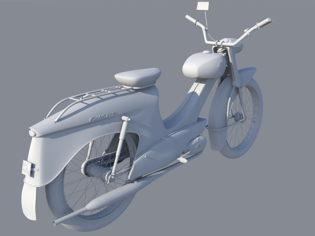 I created this model in Maya. After drawing the moped, I made UV maps of the parts so that I could import the model into Substance Painter and add texture to it. This first render is just using Mental Ray for Maya along with some basic texture maps from Photoshop.