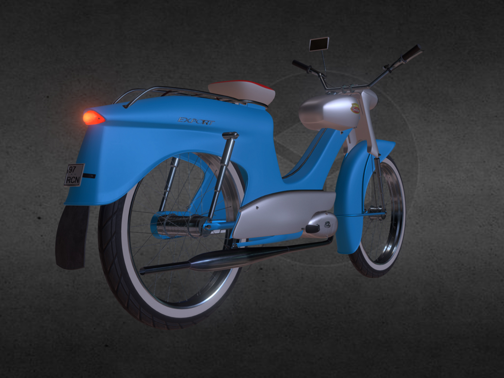 This is the moped after adding texture in Substance Painter. This includes a leather texture for the seat, adding a rubber look to the tires, detailing the tail light, and adding heat distortion to the muffler. I also added an emissive channel to make the tail light and headlight so they could appear to be lit. Details of my Substance Painter textures can be viewed below using the website called Sketchfab.